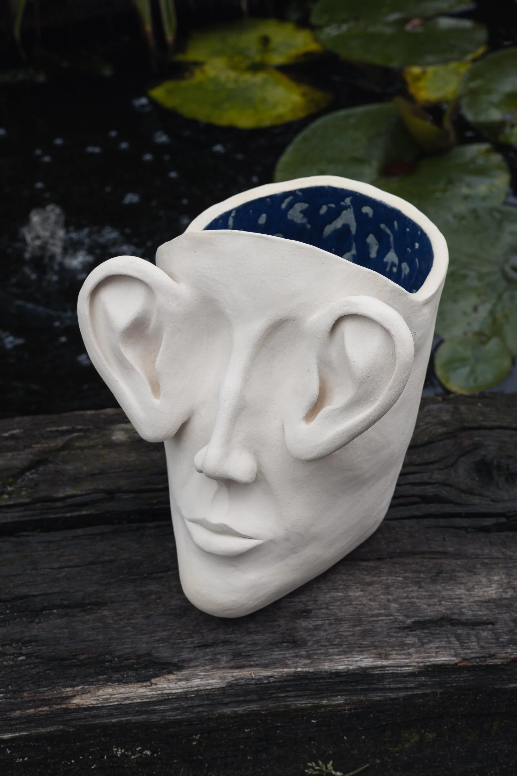 When we close our eyes for a while we can listen better. We can see what we need to hear when we empty our minds. A sculpture inspired by meditation. Can also be used as a flower pot.